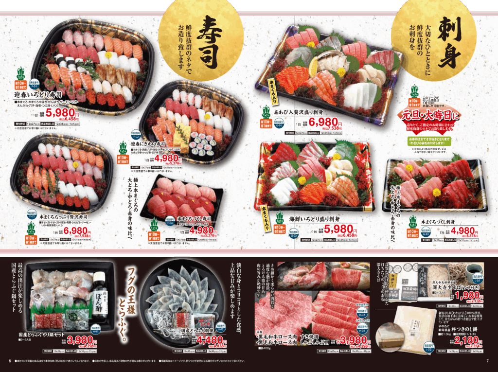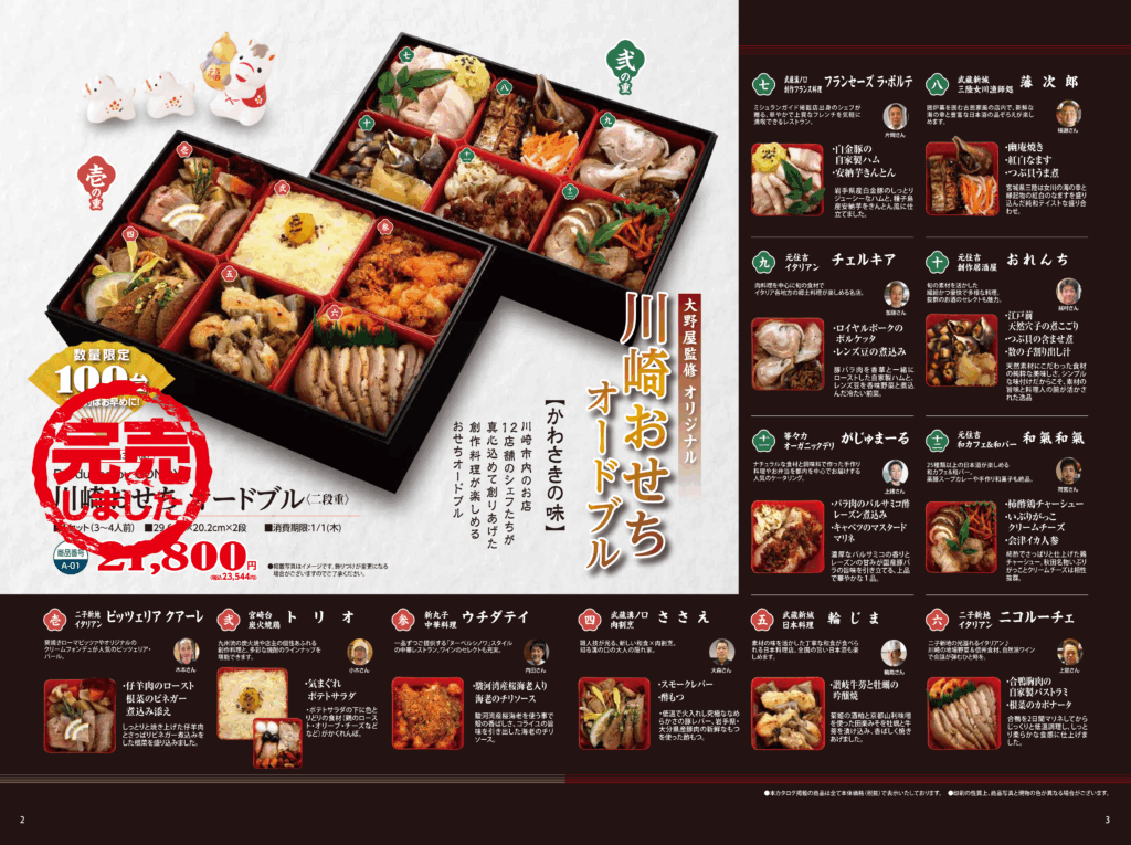 毎年大人気の川崎おせちオードブルや元旦のお刺身・お寿司の盛り合わせ、足柄牛のすき焼用・しゃぶしゃぶ用など