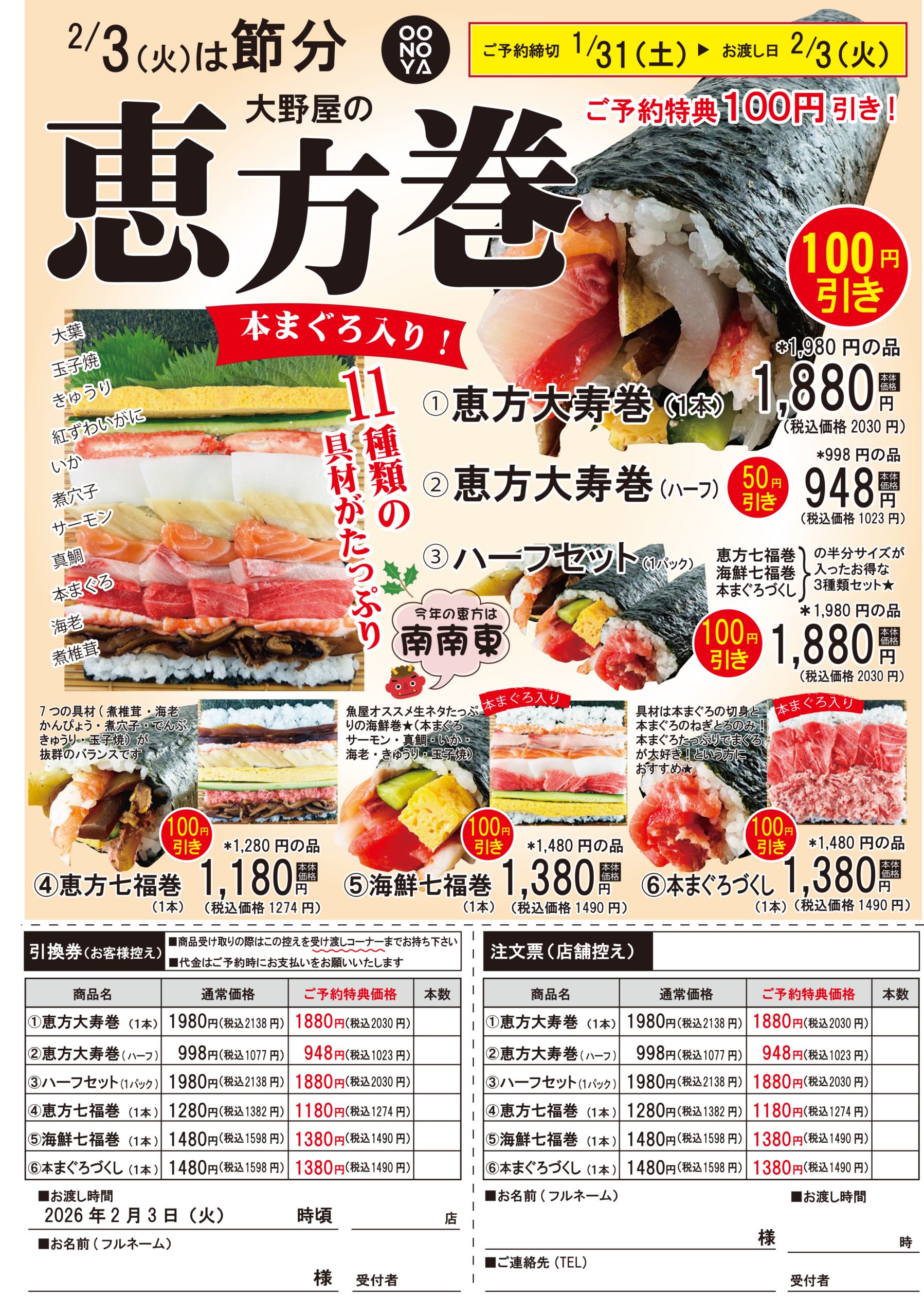 2/3(火)節分の恵方巻はOONOYAにお任せください!